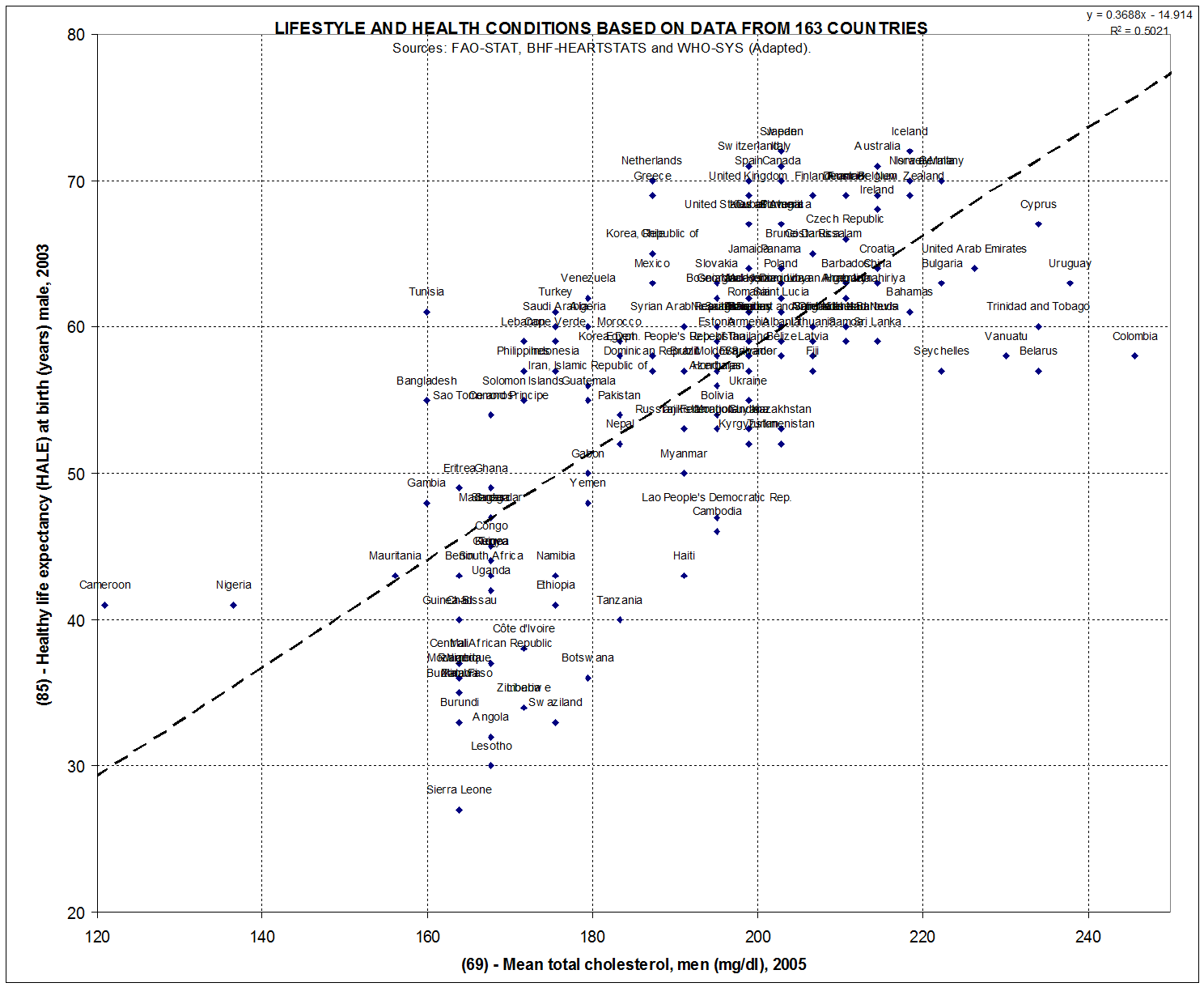 High cholesterol, rather than being a malignant condition that would predict a short life expectancy, is actually associated with higher longevity, and not only with longevity but also with a healthy life. Below are the stastistics for healthy life expectancy from 163 countries.