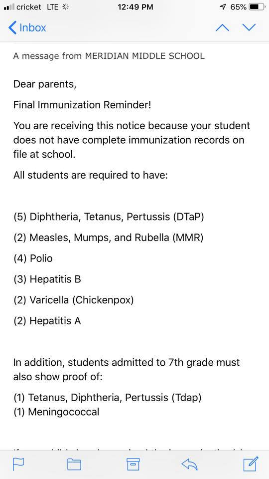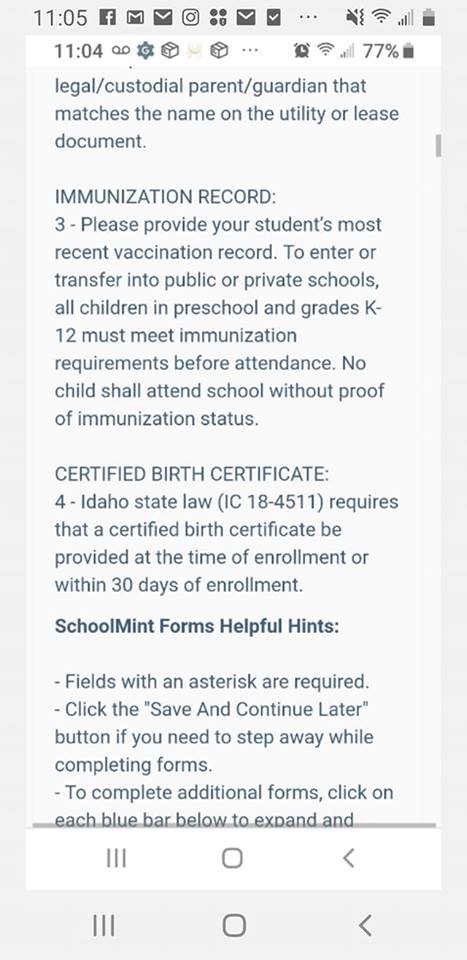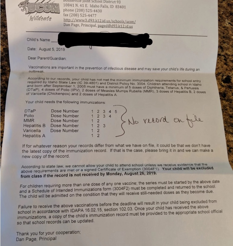 I was really bothered by the fact that we have the right to waive vaccines, and yet they write to parents that by law they have to have their vaccinations. This is wrong. They should say something like, “It is Idaho State Law that you must have complete immunization records or an Idaho School Immunization Exemption Form to register your child for school.”