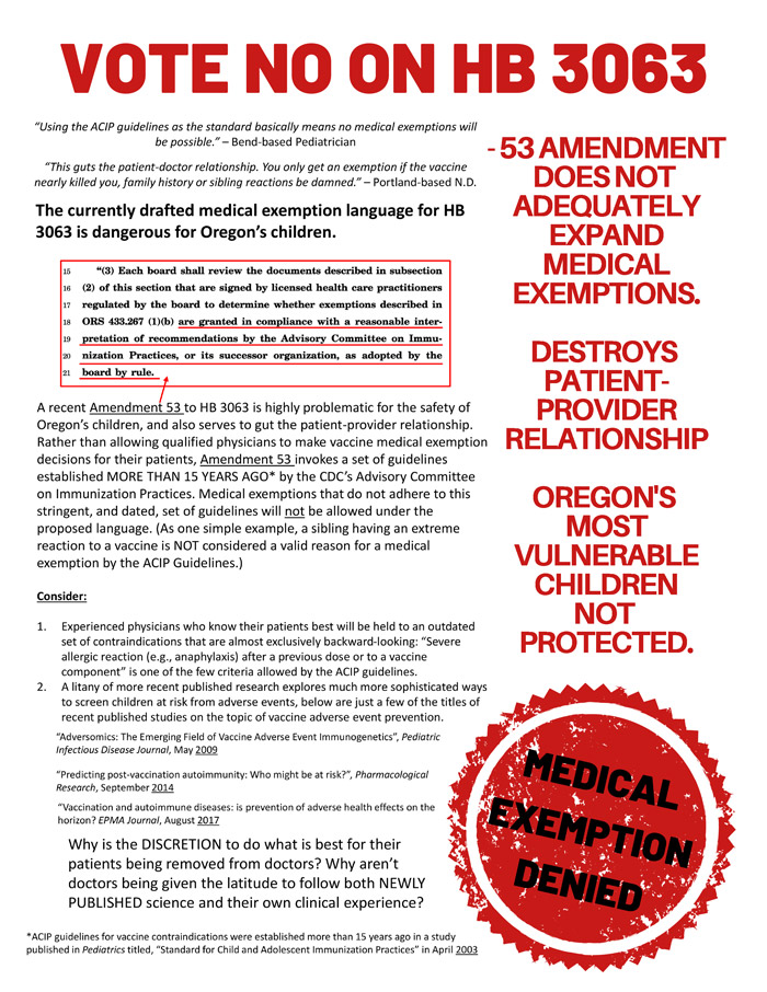 Last Friday, HB 3063, with the -53 amendment was passed out from the Joint Committee on Ways and Means and will be voted on in a House Floor vote on Monday after it’s third reading. While the bill, as it is amended currently, does include the allowance for naturopathic doctors to write medical exemptions, it DOES NOT broaden the actual criteria for medical exemptions. The bill creates new sections of law which authorizes the Medical Board, Nursing Board, and Naturopathic Board to review medical exemptions, it does NOT DELETE the existing sections of law that require the local health department to provide a secondary evaluation of the records to determine compliance with section 1 of ORS 433.267. Sections 4,5,6,7 and 8 of ORS 433.2676 remain unchanged.