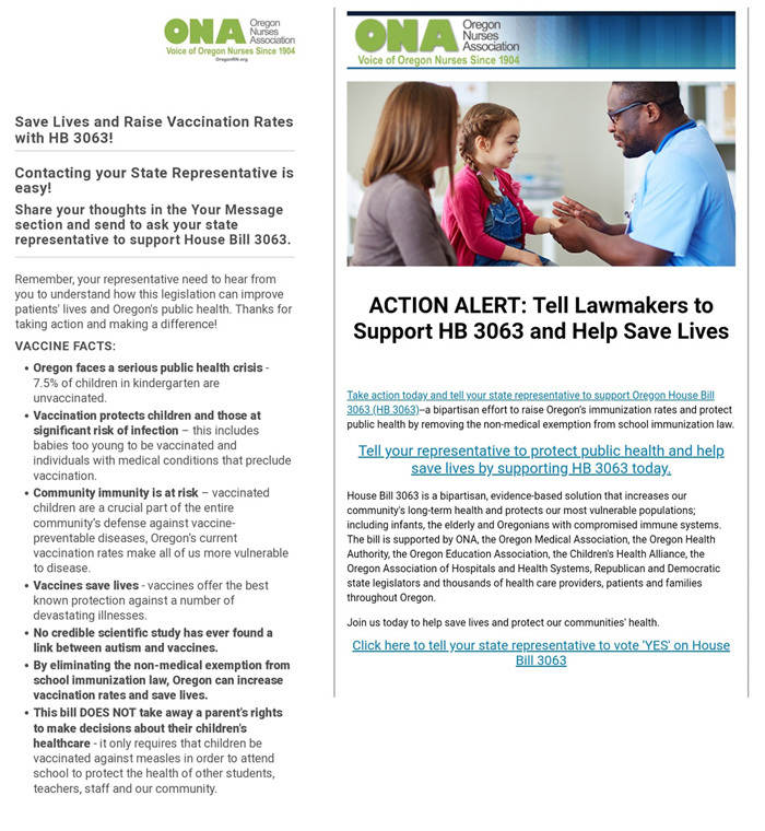 The ONA, one of the largest lobbying efforts pushing for the passage of HB 3063, sent their fraudulent e-mail on Tuesday, April 30th, that mislead their members stating, “this bill DOES NOT take away a parents’ rights to make decisions about their children’s healthcare—it only requires that children be vaccinated against measles in order to attend school to protect the health of other students, teachers, staff, and our community.”