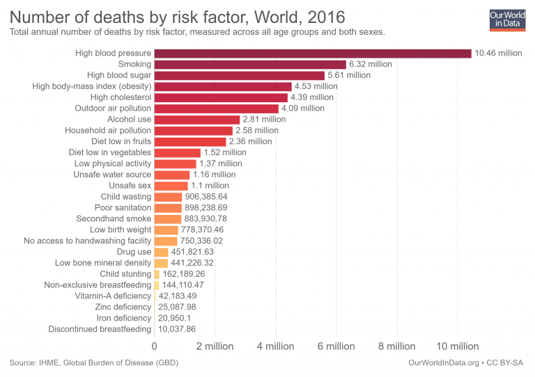 Look at this chart closely. This graphic, from 2016, distributes the number of deaths by health risk factors throughout the entire world. It shows what people die from WITHOUT an infection by a rogue virus.