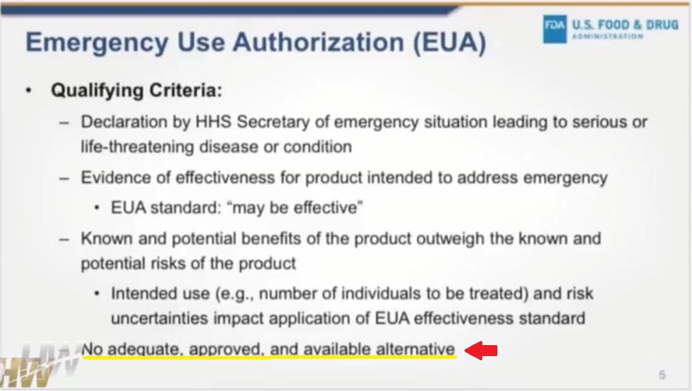 According to the “Qualifying Criteria” that allows the FDA to issue an EUA, there must be “No adequate, approved, and available alternative.”