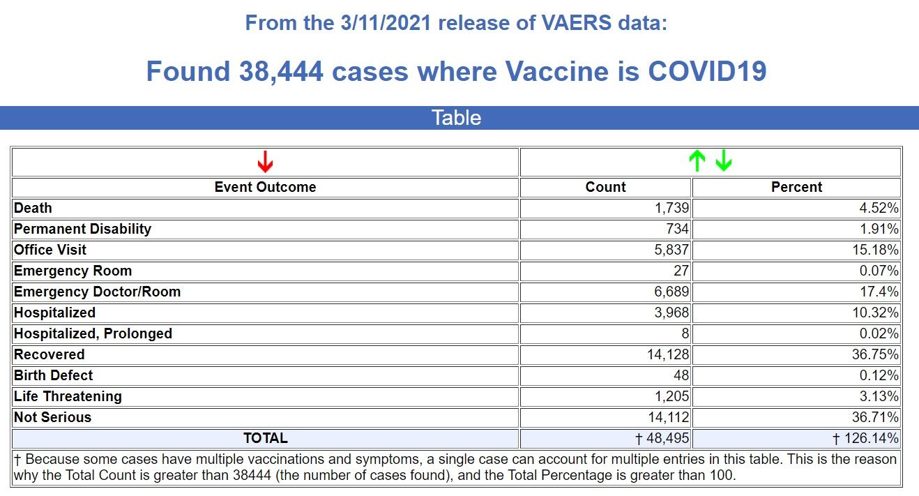 The data released by the CDC today goes through March 11, 2021, with 38,444 recorded adverse events, including 1,739 deaths following injections of the experimental COVID “vaccines.”
