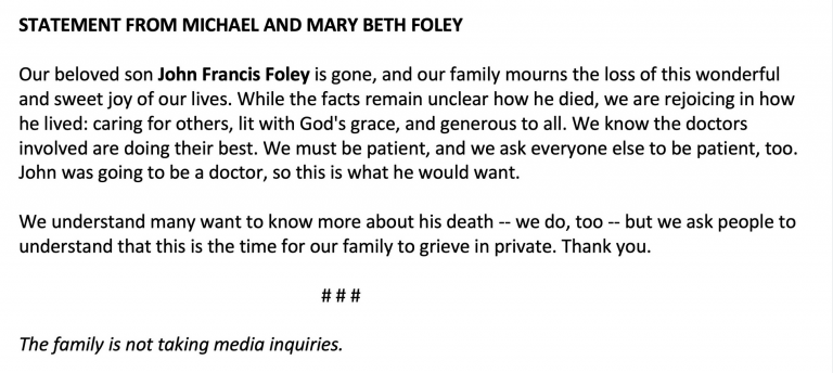 Jennifer Snyder Benedict, mother of John’s friend Maddie Benedict, also announced his death and J&J shot on Facebook. Mr. Foley’s death was also confirmed by his aunt.
