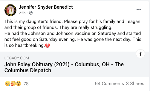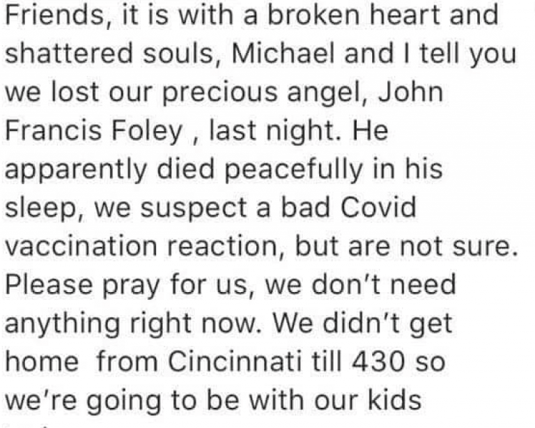 Mr. John Francis Foley voluntarily received the experimental Johnson & Johnson viral vector shot on Saturday morning, April 10 – two days before the CDC/FDA pause. He felt ill that evening, according to accounts on Facebook.