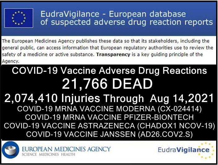 The EudraVigilance database reports that through August 14, 2021 there are 21,766 deaths and 2,074,410 injuries reported following injections of four experimental COVID-19 shots: