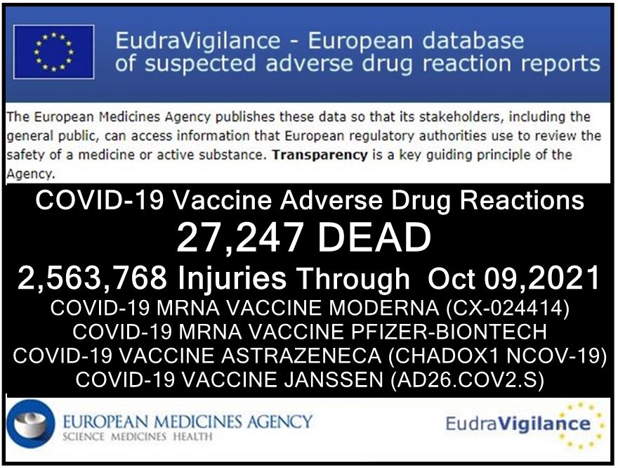 The EudraVigilance database reports that through September 25, 2021 there are 27,247 deaths and 2,563,768 injuries reported following injections of four experimental COVID-19 shots: