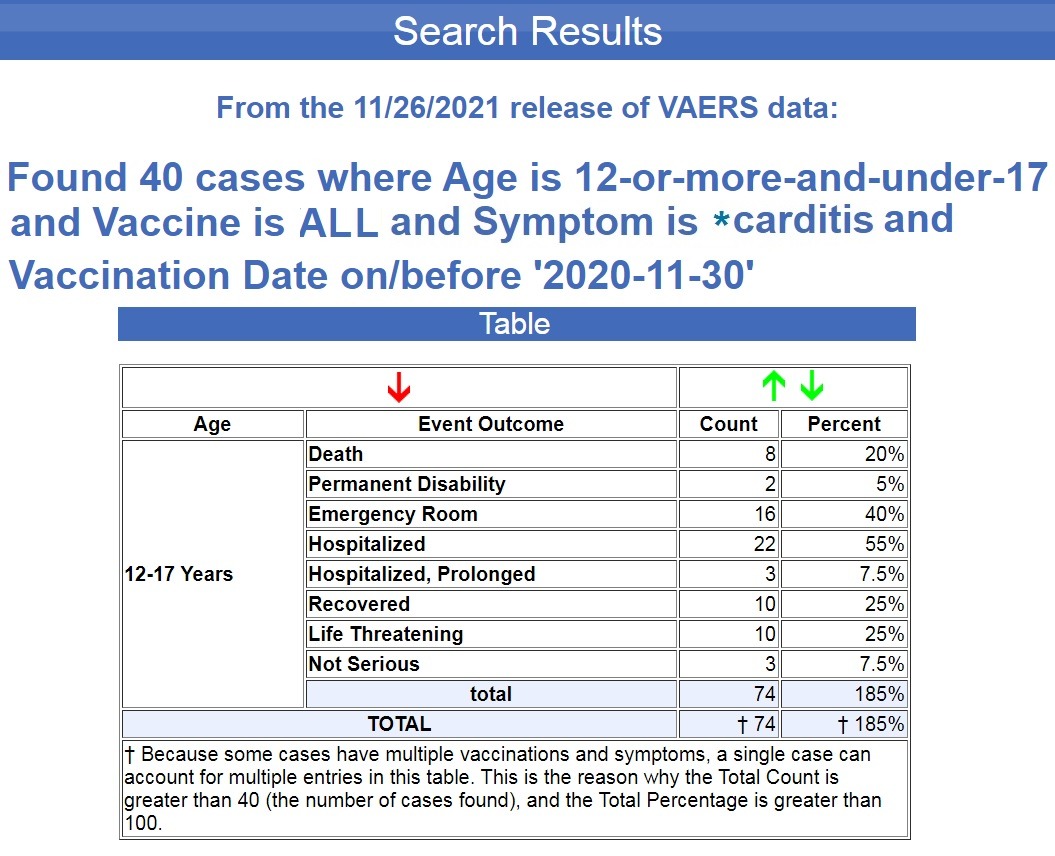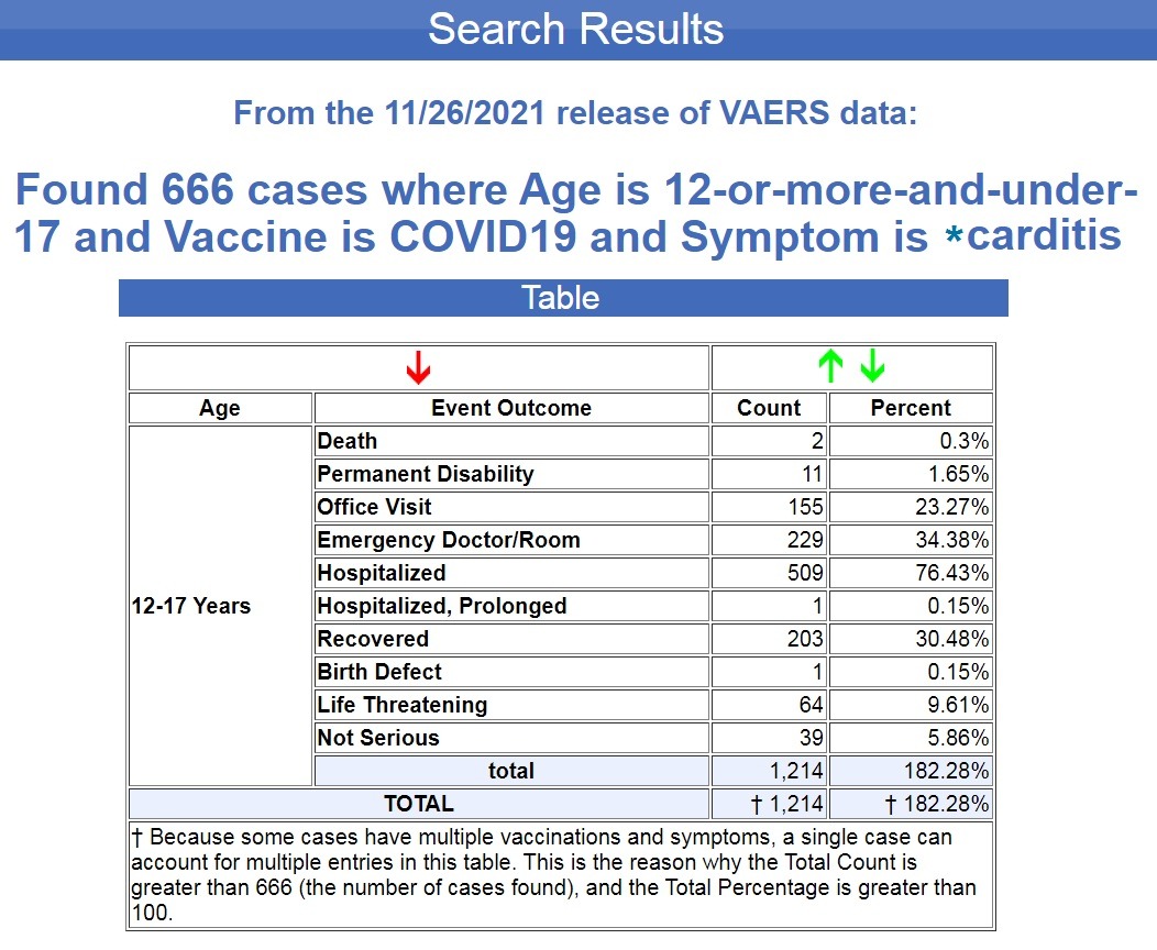 I ran a search in VAERS, the U.S. Government’s Vaccine Adverse Events Reporting System, for all cases of “carditis” following COVID-19 shots for this age group, and from the 11/26/2021 release of VAERS data, it returned a result of 666 cases. (Source.)