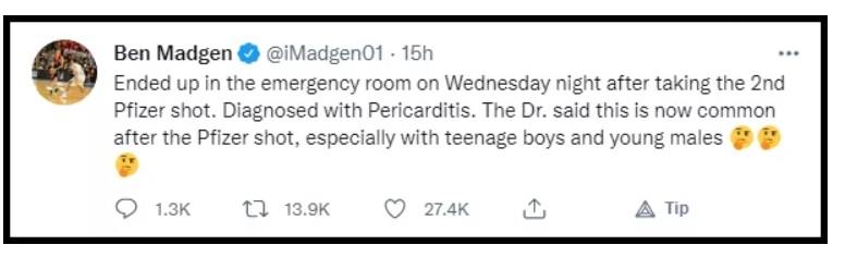 The COVID World recently reported that former Australian pro-basketball player Ben Madgen has been diagnosed with pericarditis (inflammation of the sac surrounding the heart) shortly after receiving his second dose of the Pfizer COVID-19 vaccine.
