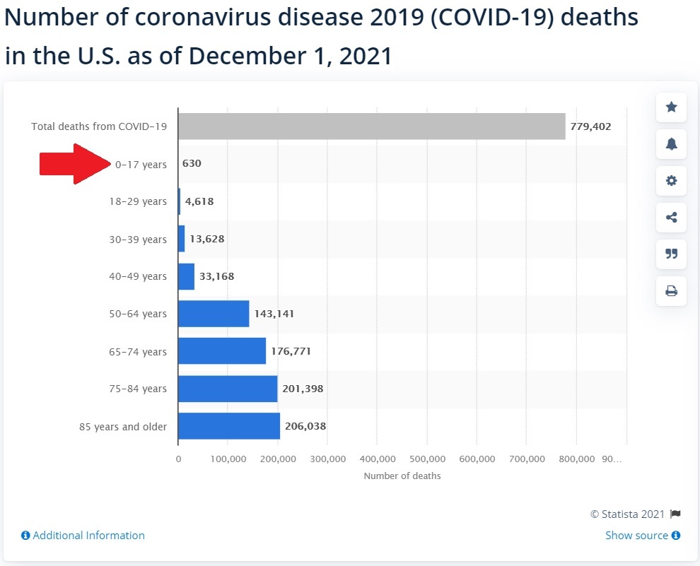 As of December 1, 2021, out of 779,402 alleged COVID-19 deaths covering almost 2 years now, only 630 of those were under the age of 17.