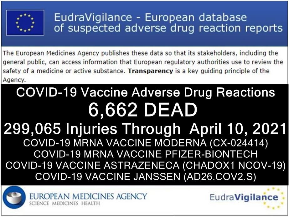 Their report through April 10, 2021 lists 6,662 deaths and 299,065 injuries following injections of four experimental COVID-19 shots: