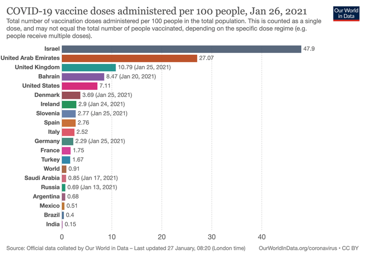 This centralized system helped Israel administer more than 2 million doses of the vaccine in under a month. In exchange, Israel received priority delivery of millions of doses of the vaccines. (Full article.)