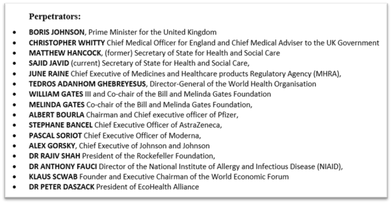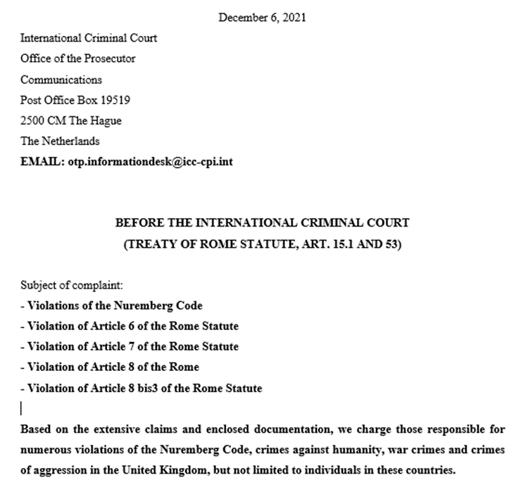The Exposé in the UK reports that a complaint has been filed with the Prosecutor of the International Criminal Court for “violations of the Nuremberg Code, crimes against humanity, war crimes and crimes of aggression perpetrated against the peoples of the UK.”