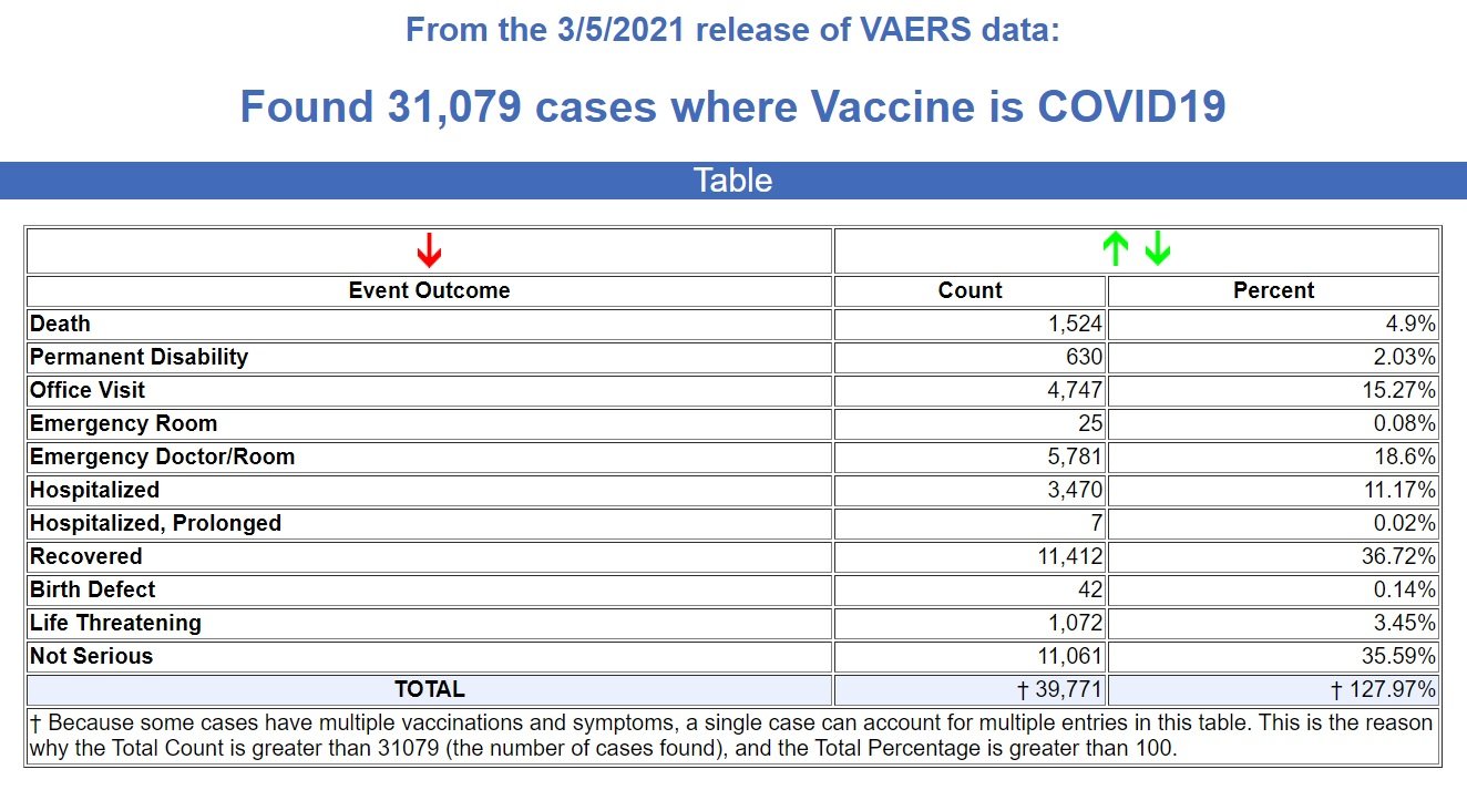 The data goes through March 5, 2021, with 31,079 recorded adverse events, including 1,524 deaths following injections of the experimental COVID mRNA shots by Pfizer and Moderna.