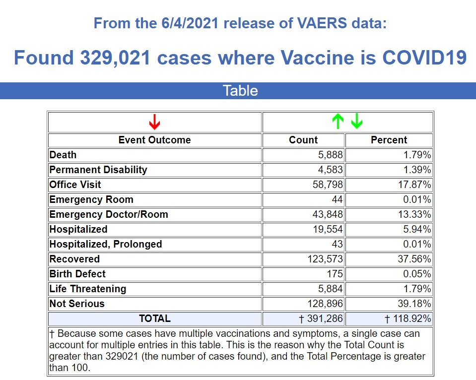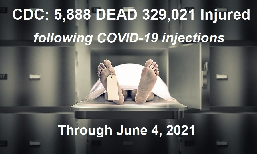 The data released yesterday, June 11, 2021, lists 5,888 deaths among 329,021 cases of injuries following COVID-19 shots. There are also another 5,884 life-threatening cases, 43,892 ER visits, 4,583 permanent disabilities, and 19,597 hospitalizations.
