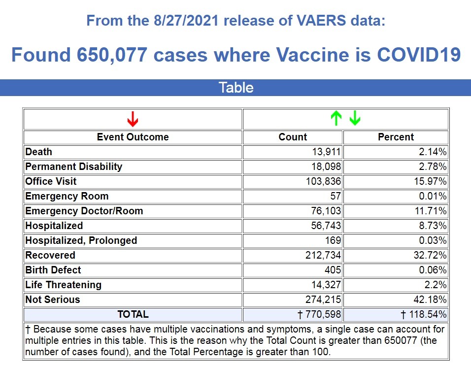 The CDC did another data dump into their Vaccine Adverse Event Reporting System (VAERS) database today. As of August 27, 2021 there have been 13,911 deaths, 2,933,377 injury symptoms, 18,098 permanent disabilities, 76,160 ER visits, 56,912 hospitalizations, and 14,327 life threatening events recorded following experimental COVID-19 “vaccinations.”