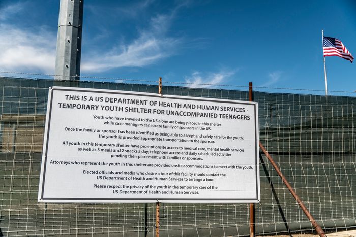 A sign outside of an Influx Care Facility (ICF) for unaccompanied children in Carrizo Springs, Texas. Photo: Sergio Flores/The Washington Post via Getty Images. Image source.