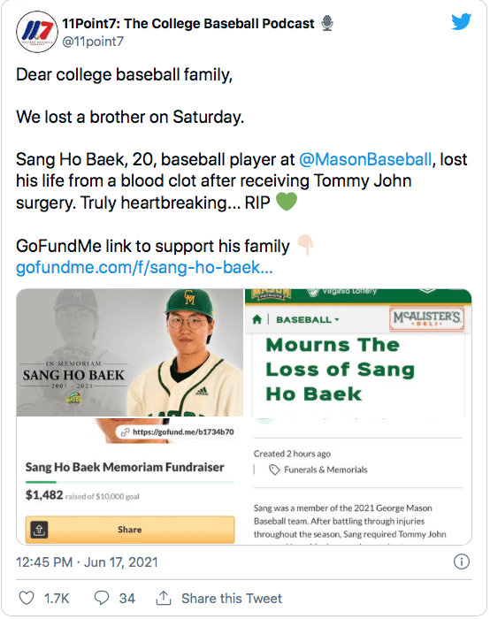 Sang Ho Baek: George Mason University baseball player is first in history to die from Tommy John surgery if you believe mainstream media