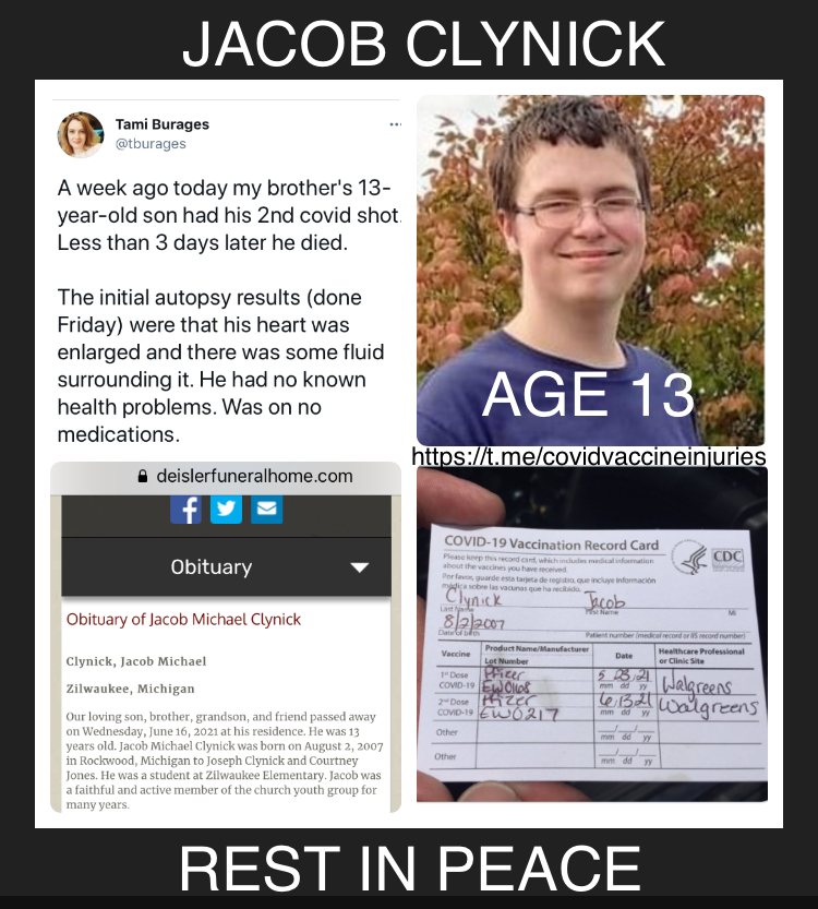 Several of our readers have alerted us to the death of 13-year-old Jacob Clynick three days after receiving the second Pfizer Bioweapon shot.