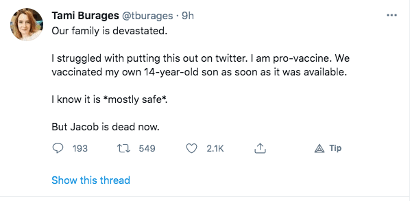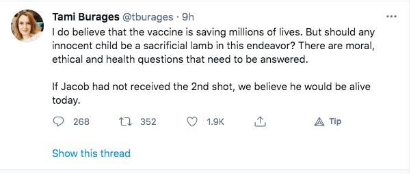 In a Twitter thread that has since been deleted by his aunt, she announced his death while still encouraging others to inject their children, as she did her own son.