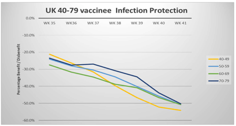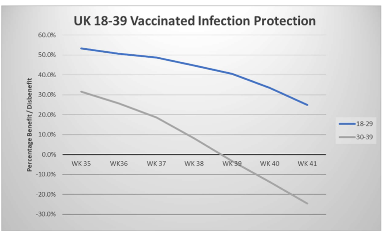 The earlier vaccinated age-group was the 30–39 cohort. Half was fully vaccinated around week 27, and by week 39 (again some 12 weeks later) had lost their enhanced infection resistance. For at least for these two cohorts, it would seem their vaccine induced resistance reduced to zero in under 3 months.