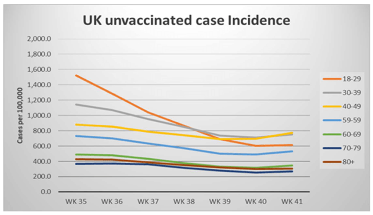 The UK has vaccinated its population mostly in age order, from oldest to youngest, and very recently began vaccinating its under-18-year-old cohort. Being the UK’s most freshly vaccinated, they exhibit a very high degree of resistance to Covid infection:
