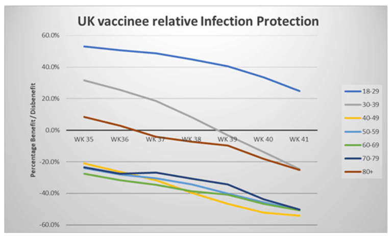 The previous UK age-group to be vaccinated was the 18–29-year-old cohort, of which half was fully vaccinated by some 9 weeks ago. While still doing better than the unvaccinated of their age, they have nevertheless lost the greater part of their relative resistance to infection. If they continue their trajectory, week 12 will see that benefit completely gone.