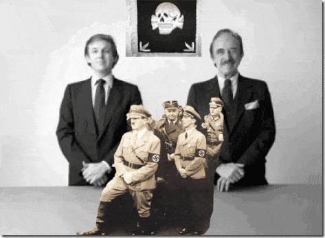 Trump & Nazis & Chabad -same crossed hands. (Editor’s note: I researched this photo and only the young Donald Trump – left – and his father – right – appear in the original photo with their hands crossed like this. The skull and bones image and the Nazi soldiers image was added in.)