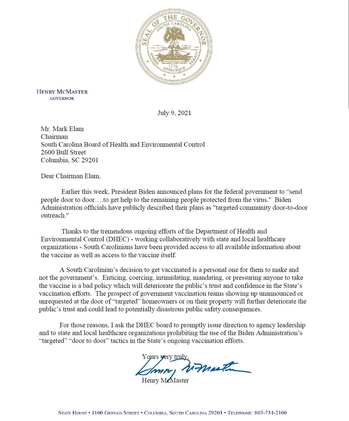 South Carolina Governor Henry McMaster published a letter that he sent to the State Board of Health opposing the effort. Here is a copy of the letter: