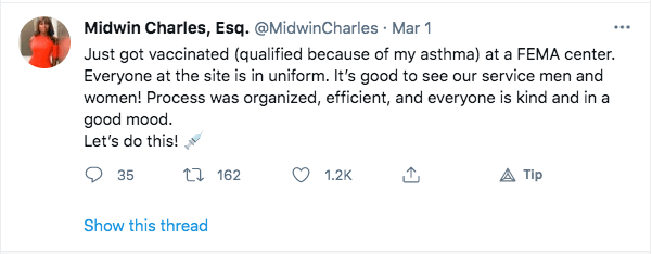 Ms. Charles posted the trendy “I’m vaccinated” announcement on Twitter on March 1.