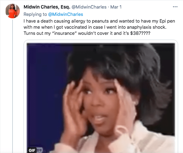 Her next tweet jokes about her “death causing peanut allergy” and that her insurance did not cover the EpiPen costs.