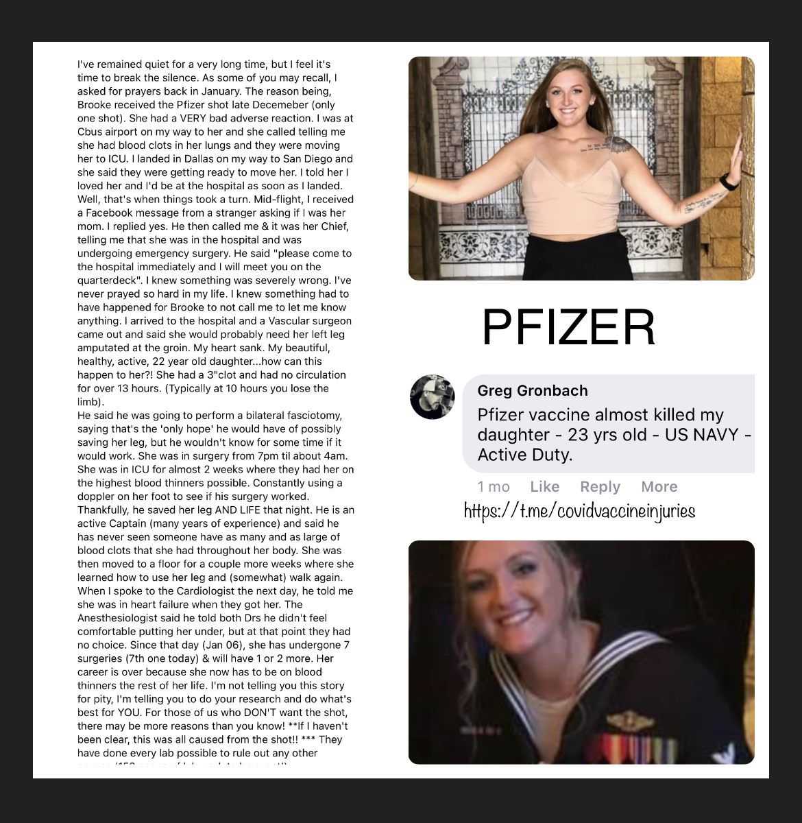 Brooke is an active duty military member who almost lost her life and her leg after her Pfizer shot, according to her parents. Her mother Rachel Gronbach and father Greg Gronbach have both posted on social media in regards to their daughter’s experience, and it sounds pretty traumatic. Brookes experience with her Pfizer shot, has changed the course of her life.