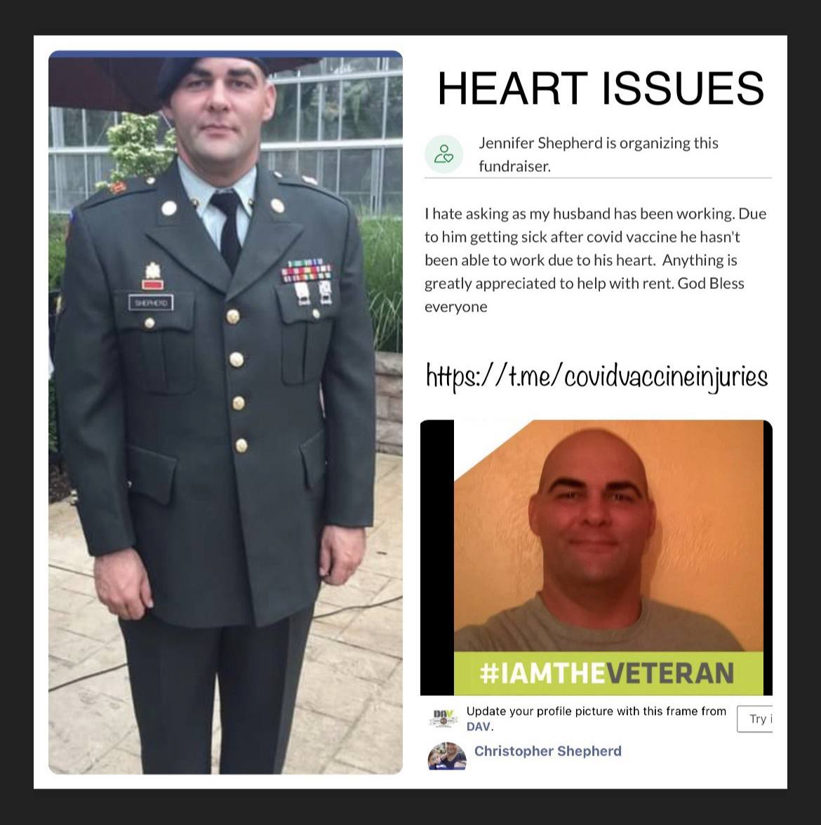 There have been several stories I have come across regarding military veterans. Christopher Shepherd is one of many examples. His wife Jennifer Shepherd started a gofundme fundraiser and claims that Chris can no longer work because his heart has been damaged since his covid shot.