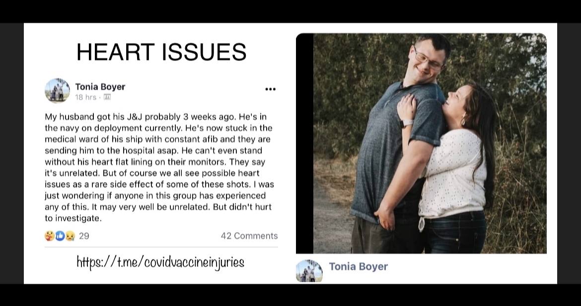 Tonia Boyer posted that her husband DJ Boyer, recently had a Johnson & Johnson shot. While deployed, DJ began having heart issues. He was placed in the medical section of his ship while waiting to get to a hospital.