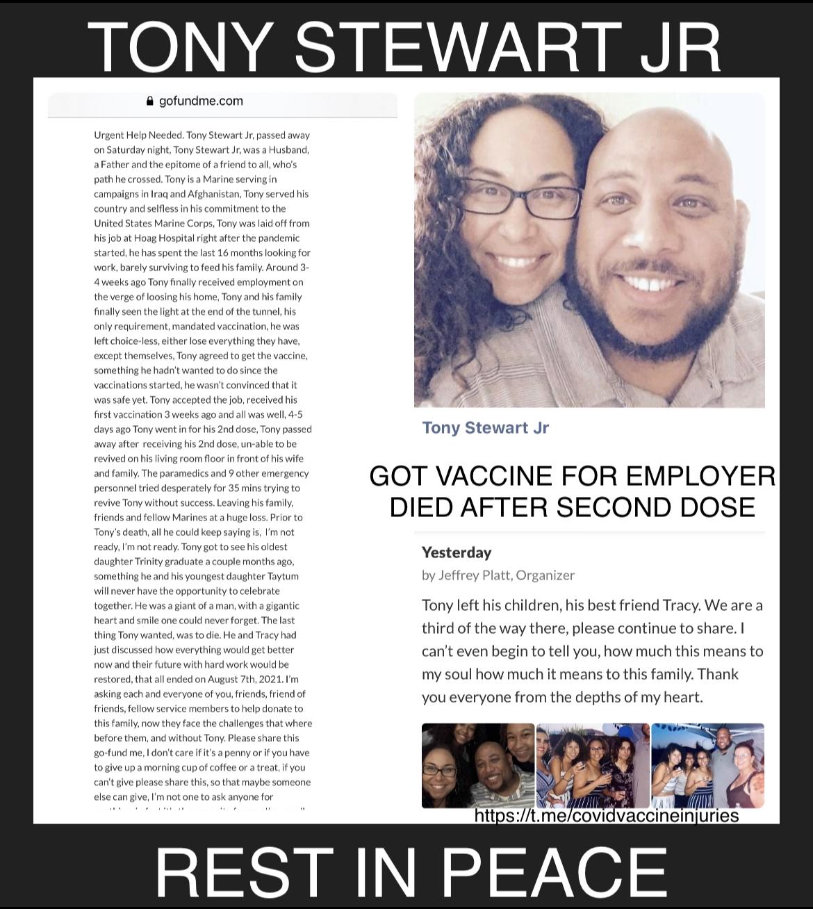 Other veterans negatively affected are Tony Stewart Jr. who died after his second dose. Paramedics and 9 others could not revive him and he died on his living room floor in front of his family.