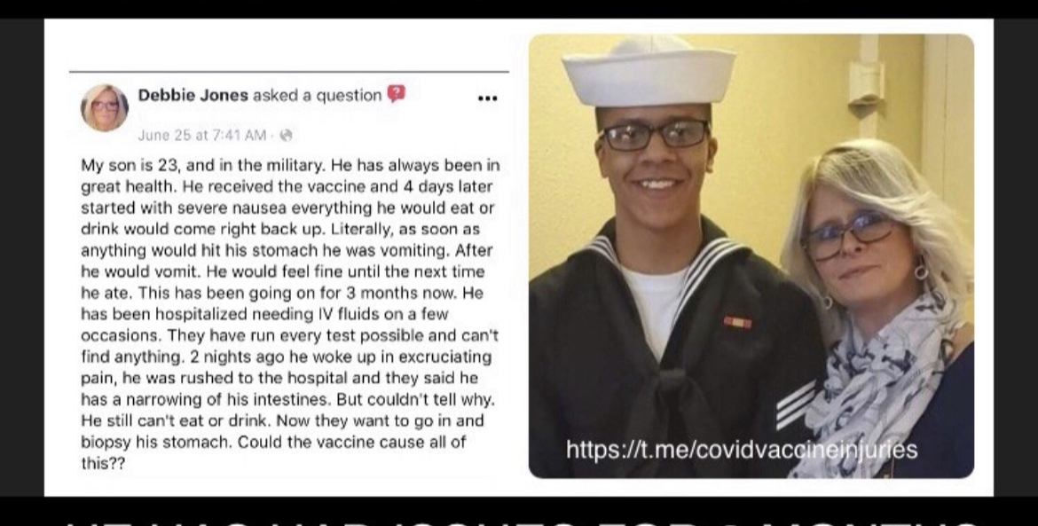 Brooke is not alone in regards to active duty military members having issues after their covid shots. Noah has been having issues for five months according to his mother Debbie Jones. His issues began four days after his shot. After many tests it was determined that he had a narrowing of his intestines.