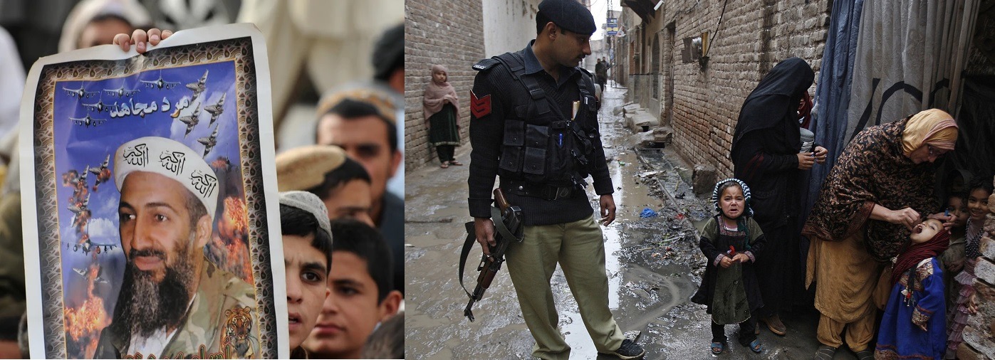 Left: SUPPORTERS OF A PRO-TALIBAN PARTY IN PAKISTAN CARRY A POSTER FEATURING OSAMA BIN LADEN. (BANARAS KHAN – Source.) Right: A health worker gives a polio vaccine to a child in Peshawar, Pakistan. (Mohammad Sajjad – Source.)