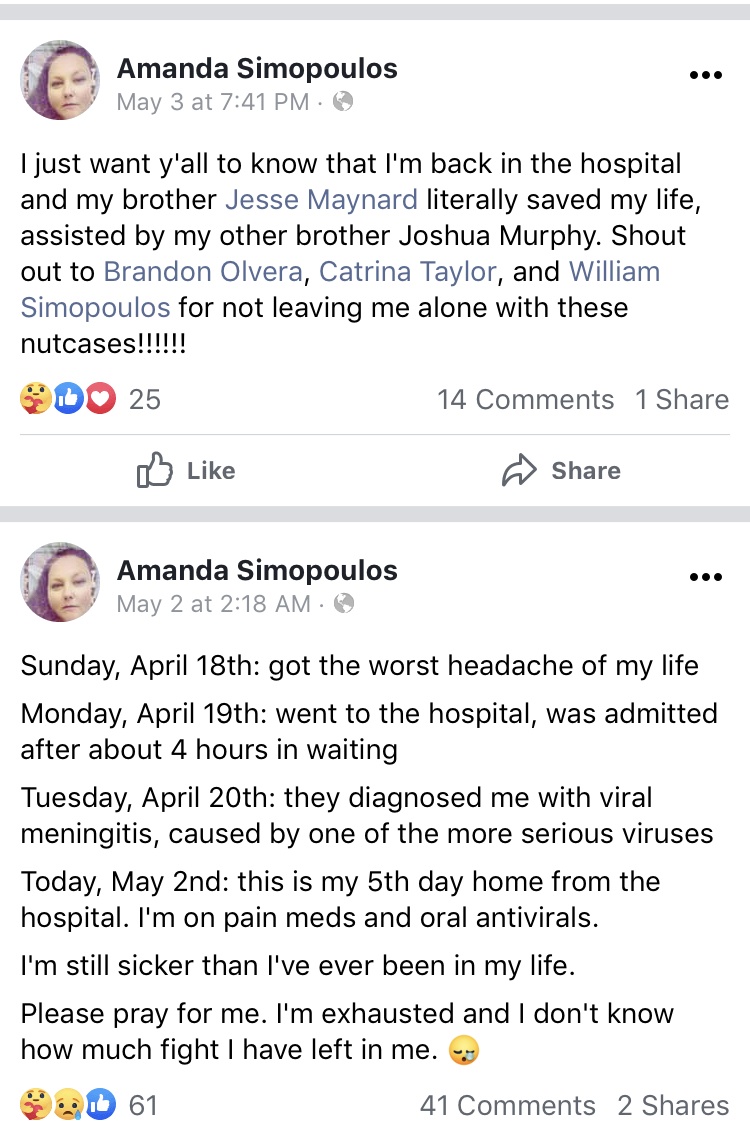 I watched several of Amanda’s videos today and looked at evidence she posted to her timeline. She has recorded videos while hospitalized and while at home. One of her videos had the title “Please Help Save My Life”.