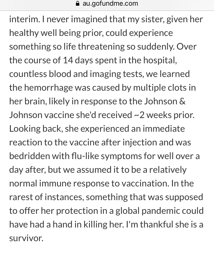 Unfortunately the medical care due to her reaction to the Pfizer vaccine has left her with some hefty medical bills. Although she had insurance coverage, for some reason her insurance will not cover a substantial amount of the expenses.