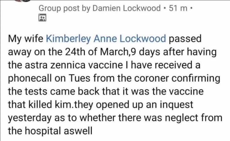 Kimberley Anne Lockwood Passed Away 9 Days After Astra Zeneca Vaccine