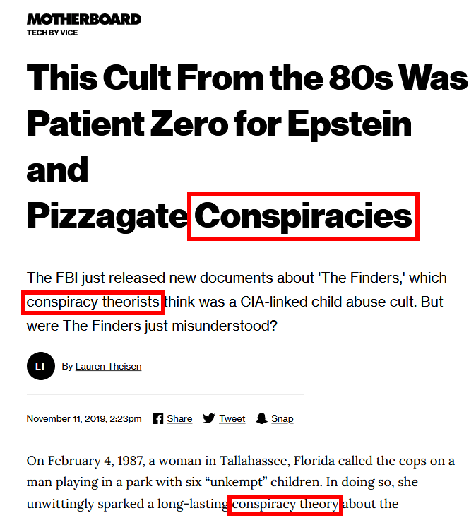 Just months after Epstein’s death, in October 2019, the FBI began releasing hundreds of Finders investigation documents to their Vault. The publication sparked a storm of attention, but virtually no corporate press coverage aside from a piece by Vice, which framed any interest in the subject as a conspiracy theory.