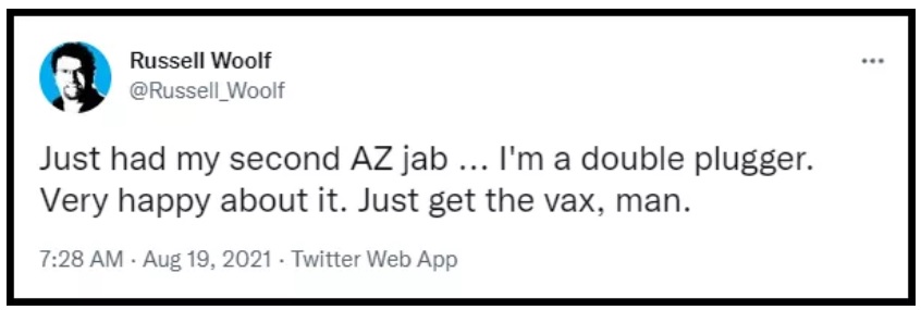 Woolf tweeted on August 19th that he had just received his second dose of the AstraZeneca COVID-19 vaccine: