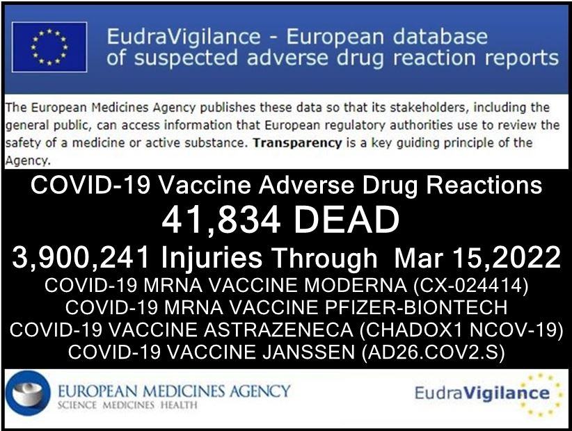 The European (EEA and non-EEA countries) database of suspected drug reaction reports is EudraVigilance, verified by the European Medicines Agency (EMA), and they are now reporting 41,834 fatalities, and 3,900,241 injuries following injections of four experimental COVID-19 shots: