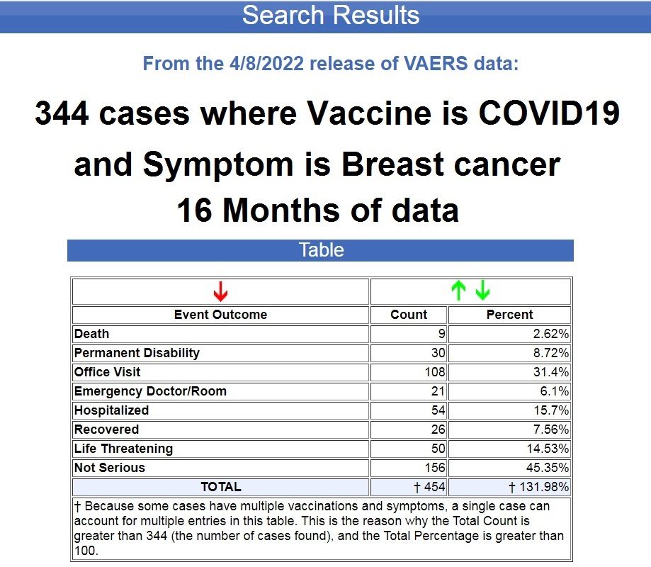 Searching for various forms of cancer in VAERS, I found 739 cases resulting in 84 deaths following COVID-19 vaccinations for the past 16 months. (Source.)