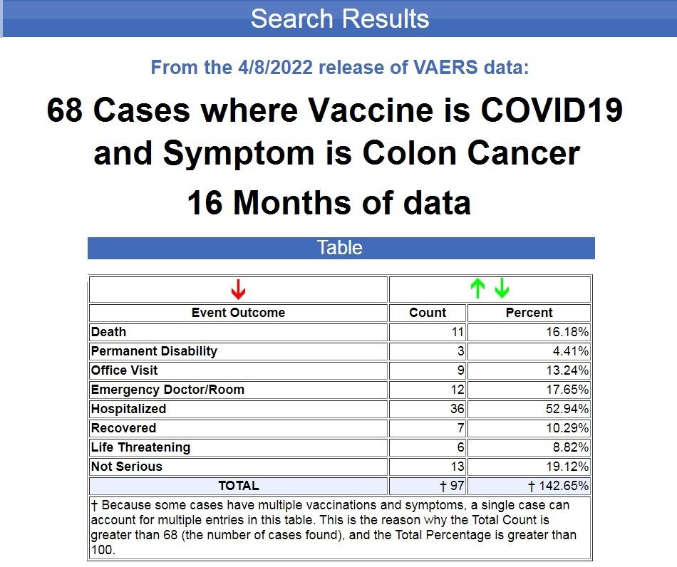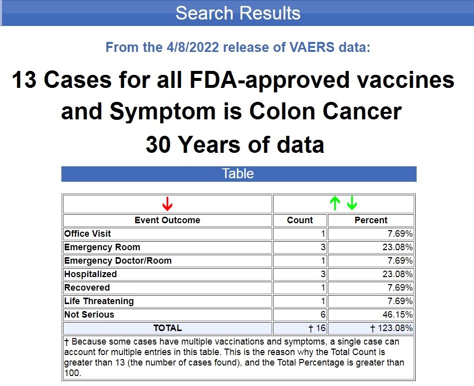 There are 68 reported cases of colon cancer following COVID-19 vaccines including 11 deaths (source), while there are 13 reported cases of colon cancer following all other FDA approved vaccines for the previous 30 years (source), which is an increase of 11,670%.