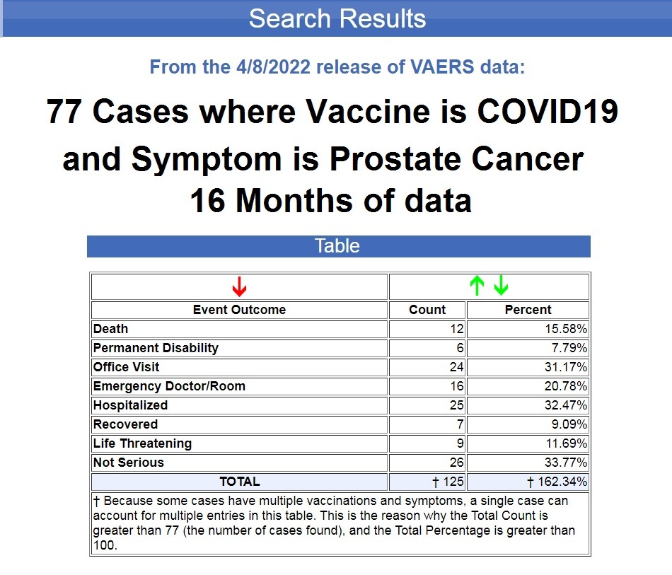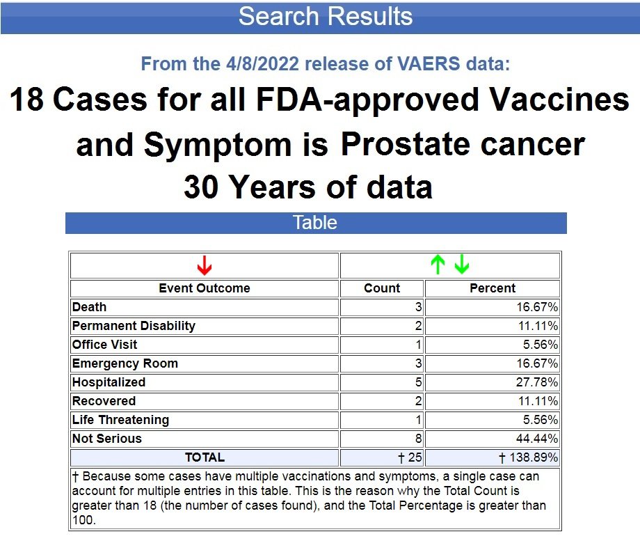 There are 77 reported cases of prostate cancer following COVID-19 vaccines including 12 deaths (source), while there are 18 reported cases of prostate cancer following all other FDA approved vaccines for the previous 30 years (source), which is an increase of 9,525%.