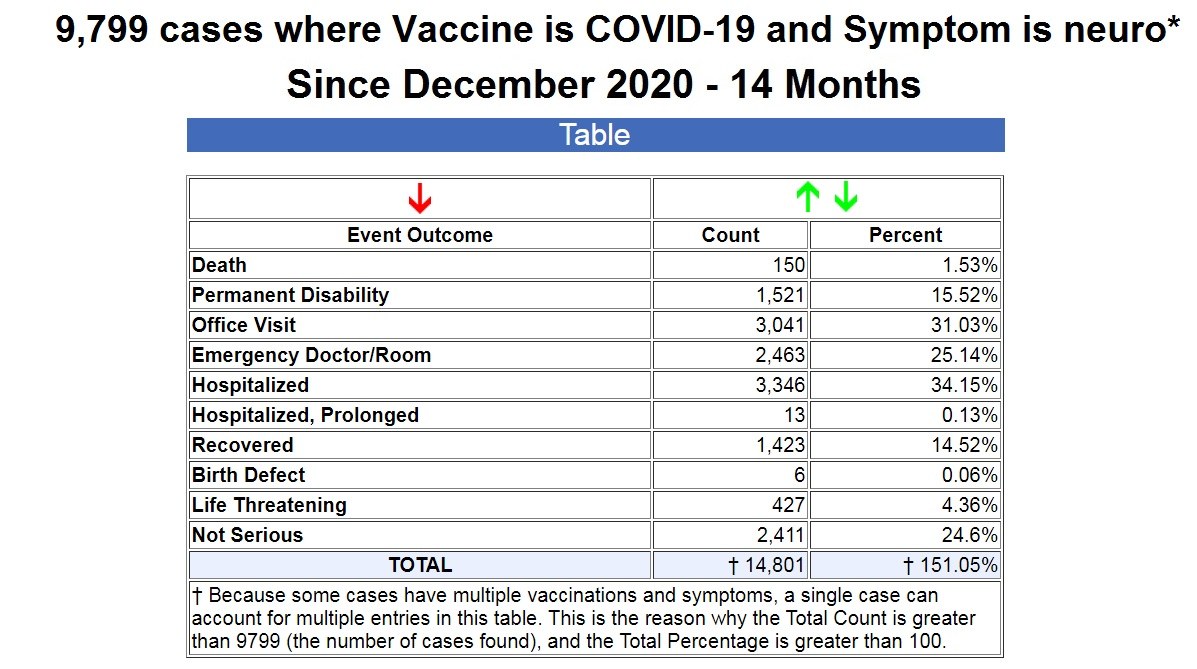 As you can see from the table above, in 14 months since the emergency use authorization of the COVID-19 vaccines, out of the 9,799 reported cases, there have been 150 deaths, 1,521 permanent disabilities, 2,463 ER visits, and 3,359 hospitalizations. (Source.)