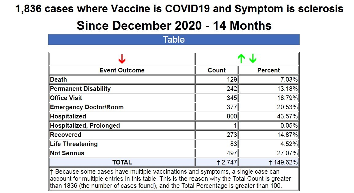 As you can see from the table above, in 14 months since the emergency use authorization of the COVID-19 vaccines, out of the 1,836 cases of sclerosis, there have been 129 deaths, 242 permanent disabilities, 377 ER visits, and 801 hospitalizations. (Source.)