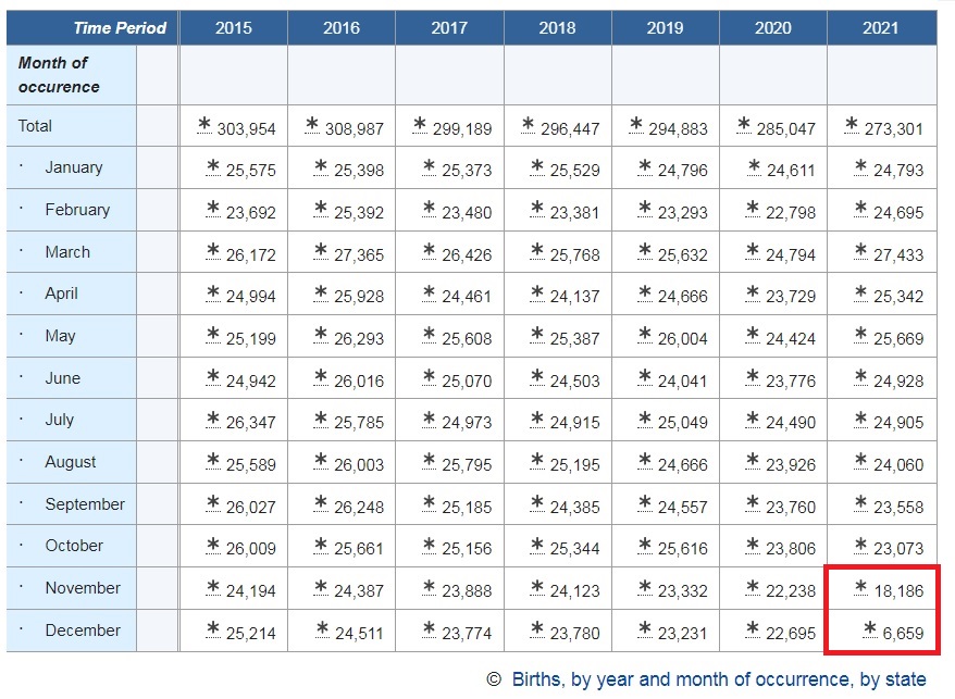 Australia appears to be one of the first countries to publish birth rates for 2021, and their December 2021 statistics show that births dropped 72% over the previous December average for the past six years. This drop in births is reportedly about 9 months after the roll-out of the COVID vaccines.