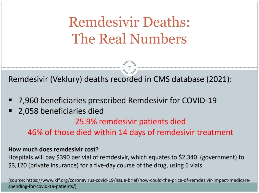 This drug, which was originally developed for ebola but never approved because it was so dangerous, has a history of scandals and many thousands of deaths since it was given an EUA (emergency use authorization) by the FDA, and then in October of 2020 it was fully approved by the FDA as a treatment for adults with COVID-19.